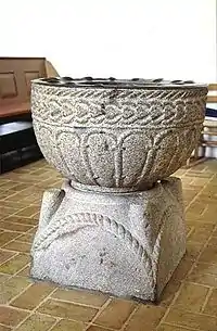 Den romanske granitfont har på kummen ringkæde under mundingsranden og derunder arkader, den svarer til fontene i Tvilum og Vejerslev.