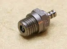 Gløderørsmotor med gløderør iskruet foroven. Gløderørsmotoren er beregnet til modelfly.