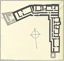 Det mest slående bygningsrest er fra en stor L-formet bygning, ofte beskrevet som et "palads". Det er i den nordlige del af området, som er opdelt af flere indre vægge i dette område. "Paladset" ligger på en kunstig terrasse og består af tre fløje. Hver af fløjene indeholder for det meste meget små rum, arrangeret i grupper på seks og adgang til af korridorer. I de to ender af L er der lignende arrangementer af rum, der ligner megaronkomplekserne kendt fra Tiryns, Mycenae Dimini og Pylos. Ikke desto mindre sår manglen på flere typiske træk ved andre mykenske paladser, nemlig et "tronrum", et (cirkulært) ildsted og et "badeværelse" en vis tvivl om bygningens betegnelse som et palads.