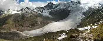 Foruden de store gletsjere, der skrider langt ned i dalene, træffer man undertiden de såkaldte hængegletsjere, der altid er små, og næsten helt holder sig til sneregionen; de ligger oftest i meget stejlt skrånende render i den øverste dalvæg, og står ikke altid i forbindelse med en firn, men kan få deres materiale ved lavineskred fra højere liggende egne.[17]