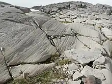 Sten, som føres frem mellem isen og et underliggende fjeld, vil kunne skure mod dette [15] og derved slibe alle ujævnheder væk. Gletsjeren graver sig stadig dybere ned (gletsjererosion). Undertiden vil sten i gletsjeren skure mod sten og grundfjeld under gletsjeren og skabe furer, de såkaldte skurestriber eller skuringsmærker.[17]