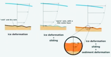 - isen kan glide plastisk, det vil sige, at de forskellige lag i isen glider med uens hastighed.[9]