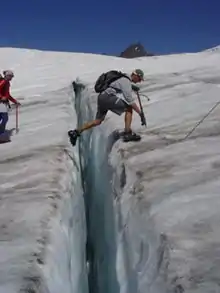 Om sommeren vil tøvejr bevirke, at der dannes en vis mængde smeltevand på gletsjerens overflade. Som følge af, at gletsjeren i kraft af indre spændinger vil danne større og mindre sprækker, vil vandet løbe ned i disse.[14] Derved bliver gletsjeren gennemvædet af smeltevand, og dens temperatur bliver omkring 0 °C helt igennem. Om vinteren vil kulden derimod, på grund af isens ringe varmeledningsevne, ikke trænge ret langt ind i gletsjerens indre. Man kan endda iagttage, at der strømmer vand fra gletsjere selv i den kolde årstid, det vil sige, at der aldrig sker en fuldstændig frysning gennem hele ismassen.