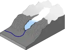 Når mængden af ophobet og omdannet sne og is er blevet tilstrækkelig stor, vil den som følge af tyngdekraften og sin egen vægt og under hensyn til terrænet begynde at bevæge sig. Når det indtræffer, taler man om en gletsjer. Isen fra de højere liggende områder vil glide nedover. I denne bevægelse vil den tage hensyn til terrænets udformning og følge lavninger på samme måde, som rindende vand følger de laveste områder i jordens overflade. Det betyder, at hvis der findes dalstrøg og lavninger længere nede, vil disse blive fyldt med is i form af gletsjere, der undertiden nærmest kan fremtræde som store meget langsomt flydende isfloder og ligge i bugtninger endog adskillige km frem gennem dem.[1] En medvirkende grund hertil er, at gletsjerisen vil være bedre til at tilbagekaste sollyset og derfor også være mere modstandsdygtig mod opvarmning og afsmeltning af isen end omgivelserne.