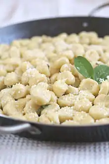 Gnocchi dækker over en række forskellige dumpling-type i det italienske køkken.[1] De fremstilles af små dejklumper af semolina,[2] almindeligt hvedemel,[3] æg,[4] ost,[5] kartoffel,[6] brødkrummer,[7] majsmel[8] eller lignende ingredienser,[9][10][11] og kan også inkludere krydderurter, grøntsager og andre ingredienser.[8] Dejen til gnocchi bliver normalt rullet ud inden den bliver skårret i små stykker nogenlunde på størrelse med en vinprop.[12] Dumplingerne bliver i nogle tilfælde trykket med en gaffel eller rivejern lignende for at lave små riller eller snit i overfladen.[8] Gnocchi bliver normalt spist som en del af første ret, men de kan også bliver serveret som contorno (tilbehør) til visse hovedretter.[8]