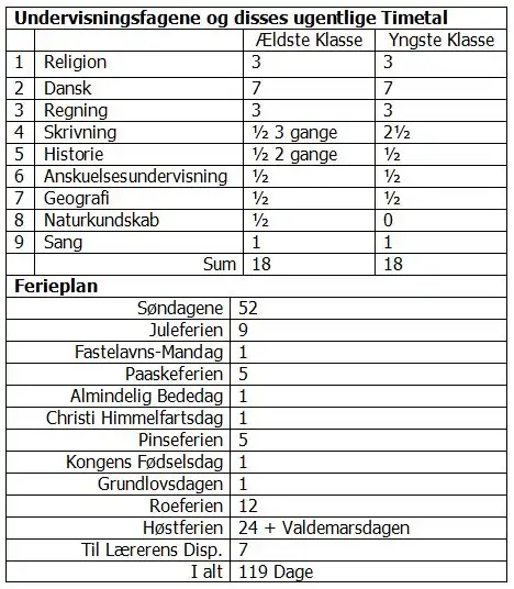 Undervisningen er fælles for Drenge og Piger. Skolen har to Klasser, som hver undervises i mindst 738 Timer om Aaret fordelte paa 41 Uger, hvorunder Gymnastikken ikke er medregnet. Hver Klasse søger Skolen 3 hele Dage om Ugen, ældste Klasse Mandag, Onsdag og Fredag, yngste Klasse Tirsdag, Torsdag og Lørdag. Skoletiden er for begge Klasser i Maanederne November, December, Januar og Februar fra 8½ til 11½ Formiddag og fra 12½ til 3½ Eftermiddag, i de Øvrige Maaneder fra 8 til 11 Formiddag og fra 1 til 4 Eftermiddag. I Sommermaanederne skal der desuden, naar Vejret tillader det, undervises ½ Time daglig i Gymnastik. Eksamen afholdes aarlig i April Maaned og om Efteraaret tillige en særlig Prøve over de Børn, der ønskes udskrevne til dette Tidspunkt.