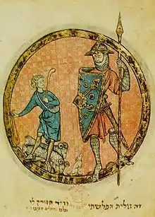 Goliat er en filistæisk kæmpe med sværd og rustning, som bliver slået ihjel med en enkelt sten fra en slynge sendt afsted af hyrdedrengen David, som senere bliver konge af Israel.