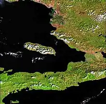 Floden Artibonite, som er den længste på hovedøen Hispaniola, løber også ud i bugten. 19°00′N 73°30′V