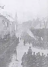 Soldater fra det 79. infanteriregiment (K.u.K. Otočaner Infaterie-regiment Graf Jellačić), kendt som "Jelačićevci", marcherer gennem Gospić i 1914.