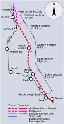 • Antal af TBMs: 4 (2 sydgående, fra Amsteg til Sedrun, 2 nordgående fra Bodio ti Faido og Sedrun. Sektionen fra Erstfeld til Amsteg vil også blive udført med TBM, måske den samme som bruges til Amsteg-Sedrun).