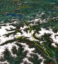 Den østlige del af Alptransit projektet. Gul linje øverst: Zimmerberg-Basistunnelen; Gul linje til venstre: Den gamle Gotthardtunnel fra 1881; Fed gul linje midtfor: Den nye Gotthard-Basistunnel; Røde linjer viser de eksisterende hovedspor.