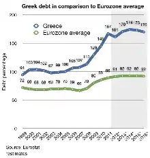 I slutningen af 2009 opstod der blandt landets kreditorer stærk frygt for, at landet ikke kunne opfylde sine gældsforpligtelser. Frygten udløste en tillidskrise på finansmarkederne og deraf følgende udvidelse af rentespændet mellem græske og andre Eurozonelandes – ikke mindst tyske - statsobligationer og forøgede udgifter til risikodækning.[5]