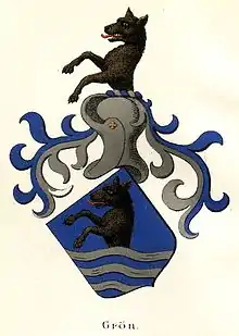 Grøn. Af de forskellige adelsslægter af dette navn hævede ingen sig op over lavadelen; mest kendt er en jysk uradelsslægt, hvis våben — en halv grå ulv over tre sølv-bølger i blåt — kendes fra Sjælland 1365. Slægten kan antagelig føre sin afstamning tilbage til Jens Grøn, der levede 1325 og som i sit våben førte en opspringende halv grå ulv over tre bølger. Slægten gik omkring 1600 over i bondestanden.