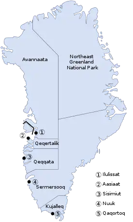 Avannaata Kommunia består fremover af de følgende tidligere kommuner, der blev nedlagt pr. 1. januar 2009: Qaanaaq Kommune, Upernavik Kommune, Uummannaq Kommune og Ilulissat Kommune. Kommune Qeqertalik består fremover af de følgende tidligere kommuner, der blev nedlagt pr. 1. januar 2009: Qeqertarsuaq Kommune, Qasigiannguit Kommune, Aasiaat Kommune og Kangaatsiaq Kommune.[1]