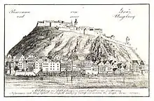 I 1805 besattes byen af franske tropper, og i maj og juni 1809 belejredes fæstningen i Graz af franske tropper. Fæstningen holdt stand, men i 'freden i Schönbrunn' konkluderedes, at fæstningen på slotsbjerget skulle rives ned. Kun to tårne, klokketårnet og urtårnet kunne reddes, ved at købes fri for en stor sum penge.