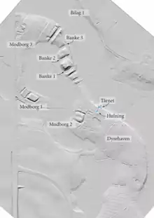 Øst og vest for de tre banker er borgen befæstet med en række grave og volde. Ikke mindre end tre grave og volde i hver ende. En af spærregravene er delt i tre, så de udgør hver sin en lille holm i nord og i syd forbundet med en vold. De små holme har muligvis stået som let fremskudte trætårne, der ved et angreb hurtigt kunne rømmes