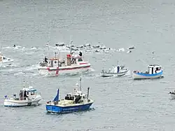 Hvalfangst i Suðuroy i august 2012. Bådene styrer hvalerne ind i en fjord, som er godkendt til grindefangst.