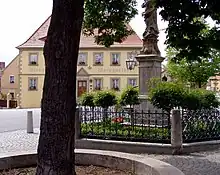 Centrum i Großlangheim med Mariasøjle og Weingasthof
