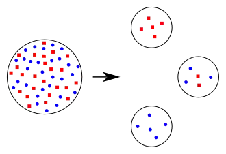 Grundlæggervirkningen: Den oprindelige population (stampopulationen) (t.v.) kan give ophav til nye populationer (t.h.)