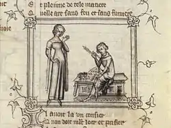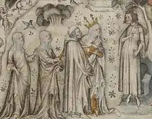 Miniature fra det 14. århundrede, hvor Moder Natur tilbyder Machaut tre af sine børn – Sans, Retorik og Musik.