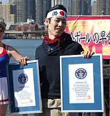 Den japanske konkurrencespiser Takeru Kobayashi med to certifikater fra Guinness Rekordbog.