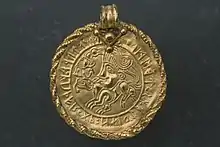 Typisk skandinavisk brakteat med svastika for neden og runeindskriften alu.