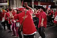 Rødtrøjer refererer til gruppen แนวร่วมประชาธิปไตยต่อต้านเผด็จการแห่งชาติ (forkortet: นปช, dansk: Forenet front for demokrati mod nationens diktatur, engelsk: United Front for Democracy Against Dictatorship, forkortet UDD), som er en politisk pressionsgruppe, der er allieret med det politiske parti Pheu Thai – tidligere eksisterede partiet under navnet Thai Rak Thai (forkort TRT)[4] – som de facto ledes af tidligere premierminister Thaksin Shinawatra. Gruppen opstod efter militærkuppet i 2006, hvor Thaksin blev afsat.[5]