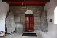 På sydsiden af koret findes en skakbrætsten med 5 vandrette og 6 lodrette rækker.[1]