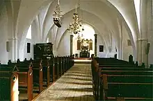 Den høje korbue er bevaret med profilerede kragbånd og karnissokkel. I sengotisk tid fik kor og skib indbygget krydshvælv. Mellem skib og sydkapel er brudt to spidsbuede arkader. Trappen til prædikestolen er ført op gennem arkadepillen. Altertavlen er en lutheransk fløjaltertavle fra 1537-38. Prædikestolen er fra slutningen af 1800-tallet.