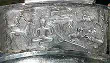 - På et panel ses en hornet gud, der højst sandsynligt er den keltiske Cernunnos, dyrenes hersker. Han sidder med en hornet slange i den ene hånd og en guldhalsring i den anden. Den hornede slange går igen på mange af panelerne. Omkring den hornede gud ses forskellige dyr – hjorte, en ulv, en delfin med rytter, en løve og to griffer.