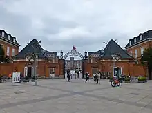 Den meget rigt dekoreret indgangsport er restaureret for nylig, inkl. de originale gaslygter, der kom retur til kasernebygningen for få år siden. Læg mærke til at porten er så høj at en rytter skal kunne ride under den, uden at sænke sin fane.