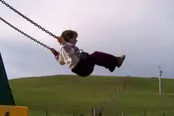 - En person sidder på sædet, mens en anden person skubber blidt i samme retning som gyngen bevæger sig i, så gyngen gynger højere og højere frem og tilbage.