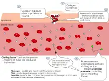 Det første trin, der også kaldes den primære hæmostase består i en sammentrækning af blodåren omkring skadestedet hvorefter blodpladerne danner en prop, som dækker skadestedet. Dette efterfølges af den sekundære hæmostase, der også er kendt som koagulation. Heri indgår en kaskade af kemiske processer, der involverer et antal proteiner som findes i blodet, som tilsammen medfører at blodet danner en blodstørkning (el. koagel), som forstærker den prop som blodpladerne indledningsvist etablerede. Hele processen afsluttes med fibrinolysen, som er den proces hvorunder koaglet (blodstørkningen) nedbrydes, så blodet atter kan flyde som normalt i blodåren.