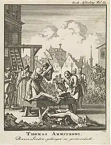 - I 1684 henrettedes den britiske officer Sir Thomas Armstrong som straf for sin deltagelse i Ryehouse-plottet, der havde til formål at myrde den engelske konge Charles 2. Efter dommen for højforræderi, førtes han frem for offentligheden til hængning, opsprætning og partering.[11]
