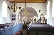 Kirken har flade bjælkelofter, korbuen er udvidet og pudset. Gravkapellet mod øst er afskilret fra koret ved en væg bag alteret. To stukportaler med smedejernsdøre fører fra koret ind til gravkapellet, som er overdækket af fire stukdekorerede grathvælv, der hviler på en midterpille. Prædikestolen er fra omkring 1600.