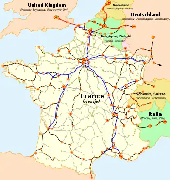 | Planlagt | LGV Centre France Paris Austerlitz-Orléans-Bourges-Clermont-Lyon[11] | 360 km/t | 480 km | 2018-2022 | TGV | 25 kV, 50 Hz | |