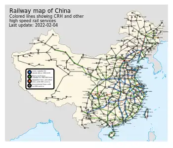 | I drift | Changji Intercity Line (Changchun–Jilin) | 250 km/t | 111 km | 10. januar 2011[8] | 25 kV, 50 Hz | ETCS | ||