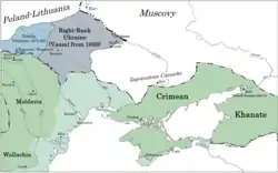 Historien om Ukraines højre og venstre bred er tæt forbundet med Khmelnytsky-oprøret i 1648-57. Området var en del af det Den polsk-litauiske realunion under Huset Vasa indtil den den polsk-russiske krig udløst af Khmelnytskys Perejaslav-traktaten fra 1654, med Muscovy-alliancen.[1] Efter den 13 år lange konflikt overtog det sejrrige Zar-Rusland Ukraine på venstre bred, sammen med byen Kyiv i 1667 efter Andrusovo-traktaten. I mellemtiden forblev Højrebreds-Ukraine i realunionen indtil Polens deling i slutningen af det 18. århundrede. Som en del af Lillepolske provins i Kongeriget Polens krone blev den opdelt i to voivodskaber: Kiev og Bracław. I 1669 tillod Hetman Petro Doroshenko Højrebreds-Ukraine at være en del af det osmanniske imperium.[2] Det sydligste Podolien på Ukraines højre bred blev invaderet af osmannere i 1672. Efter de kristne magters sejr i 1683 i slaget ved Wien, returnerede Karlowitz-traktaten i 1699 disse lande til Den polsk-litauiske realunion. I løbet af 1700-tallet fandt to kosakopstande sted. I 1793 blev Højrebreds-Ukraine annekteret af det russiske imperium i Polens anden deling,[3] og blev en del af guberniya (guvernementet) i Lille Rusland.