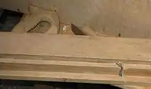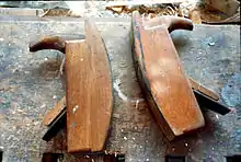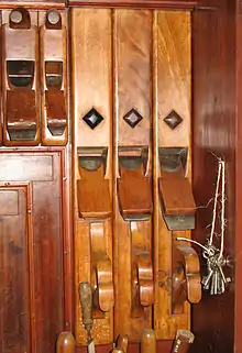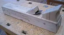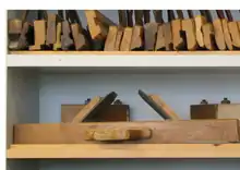 ![]() Radikalhøvl med to jern placeret i hver deres retning. Set på nationalmuseets møbelkonserveringsværksted i Brede. På hylden ovenover ligger en del forskellige Profilhøvle |
