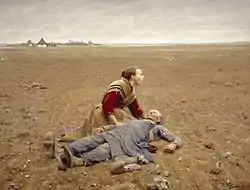 Brendekilde var træskærer og stenhuggersvend og fulgte på Kunstakademiet uddannelsen som modellerer (skulptur). På Kunstakademiet mødte han L.A. Ring, der kom fra fattige kår i landsbyen Ring. Og han fik en lang række venner. I sit debutværk Fra landsbyen fra 1882 blev netop landsbymiljøet motivet. Senere lavede han socialrealistiske værker som Udslidt fra 1889, der forestiller en landarbejder, som er faldet om på marken. Som flere af hans hovedværker findes det på Brandts i Odense.