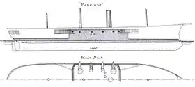 ![]() Bemærk indhakkene i skroget på Penelope, der gjorde det muligt for de yderste kanoner i bredsiden at skyde forud og agterud. | |