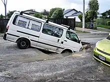Naturlig likvefaktion i forbindelse med et jordskælv, hvor kørebanens bestanddele er gået fra fast til flydende.