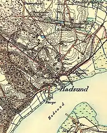 Flækken og Ladepladsen Hadsund (gml. Form: Haddersund), ved Fjorden og Grænsen af Vive Sogn — 1/2 1890 med 110 Huse og 701 Indb. (deraf 21 og 145 i Vive Sogn); 1801: 9, 1840: 7, 1860: 170, 1880: 281 Indb. —, med Kirke, Skole, Realskole (opf. 1896), Missionshus (opf. 1900), Filial af Terndrup Apotek, Lægebolig, Sparekasse (opr. 1/9 1884; 31/3 1898 var Sparernes Tilgodehav. 132,682 Kr., Rentef. 4 pCt., Reservef. 10,350 Kr., Antal af Konti 701), Fællesmejeri, Svineslagteri, Maskinfabrik, Savværk, Mineralvandsfabrik, Ølbryggeri, Vandværk, Købmandsforretninger, Haandværkere, Markedsplads (Marked i Apr., Maj, Sept. og Okt.), Gæstgiveri, Havn (anl. omtr. 1860, ved Brohovedet 10 F. Vand), Lods-, Toldassistent- og Dampskibsstation, Færgefart til det lige overfor liggende Søndre-Hadsund (Hadsundhuse), Jernbanestation, Endepunkt for Aalborg-Hadsund Banen, Telegraf- og Telefonstation samt Postkontor.[22]