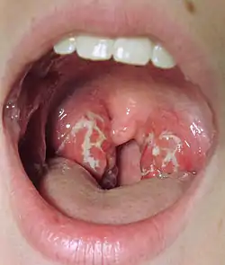 Halsbetændelse med hævelse, rødme og belægninger på tonsillerne.