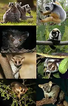 På Madagaskar har halvaberne generelt få naturlige fjender, og har udviklet sig til de dagaktive lemurer. Før mennesket kom til øen, fandtes arter af lemurer helt op i gorilla-størrelse.[5] De øvrige halvaber er stort set alle natdyr. Hele gruppen, inklusiv de dagaktive lemurer mangler farvesyn, og føden består i højere grad af insekter og andre små dyr end af frugt som man normalt forbinder med primater. Hjernen er desuden lille, men lugtelappen er veludviklet.[6][4]