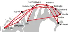 | Widerøe[22] | Alta, Berlevåg, Båtsfjord, Hasvik, Honningsvåg, Kirkenes, Mehamn, Sørkjosen, Tromsø, Vadsø, Vardø | |