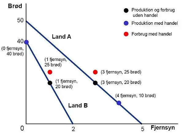 Land A har altså den absolutte fordel i at producere både brød og fjernsyn. Det afspejler sig også i transformationskurverne, hvis man antager af disse er lineære, hvor land B’s hele tiden ligger under land A’s.