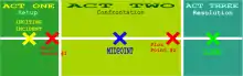 Skematisk beskrivelse af en klassisk fortalt handling opdelt i akter og plot samt klimaks.