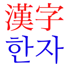 Hanja skrevet med hanja-tegn (rødt) og skrevet på koreansk hangul (blåt).