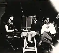 ![]() Hannah Höch længst til højre sammen med Nelly van Doesburg og Piet Mondrian | |
